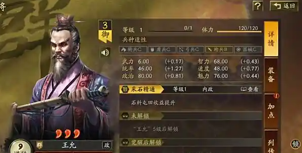 王允这位武将主要定位在内政方向,他的核心价值体现在资源管理方面。咱们可以安排他担任采石官,这样能提高石料屯田的收益,对于...