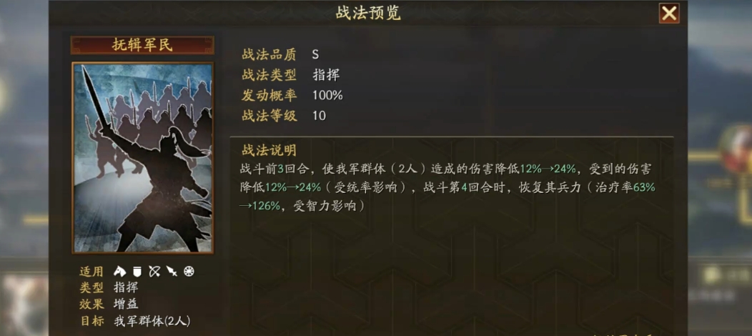 抚辑军民是一项兼具减伤与恢复效果的强力战法,适用于统率值较高的武将。该战法在前三回合降低我军群体两名武将的伤害输出与所受...